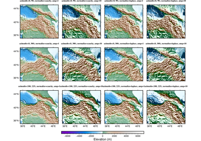 • azimuth (float | Sequence[float] | None, default: None) – azim or (azim, azim2). Azimuthal direction for a directional derivative; azim is the angle in the x,y plane measured in degrees positive clockwise from north (the positive y-direction) toward east (the positive x-direction). The negative of the directional derivative, \(-(\frac{dz}{dx}\sin(\mbox{azim}) + \ \frac{dz}{dy}\cos(\mbox{azim}))\), is found; negation yields positive values when the slope of \(z(x,y)\) is downhill in the azim direction, the correct sense for shading the illumination of an image by a light source above the x,y plane shining from the azim direction. Optionally, supply two azimuths, azim/azim2, in which case the gradients in each of these directions are calculated and the one larger in magnitude is retained; this is useful for illuminating data with two directions of lineated structures, e.g., 0/270 illuminates from the north (top) and west (left). Finally, if azim is a file it must be a grid of the same domain, spacing and registration as grid that will update the azimuth at each output node when computing the directional derivatives.
